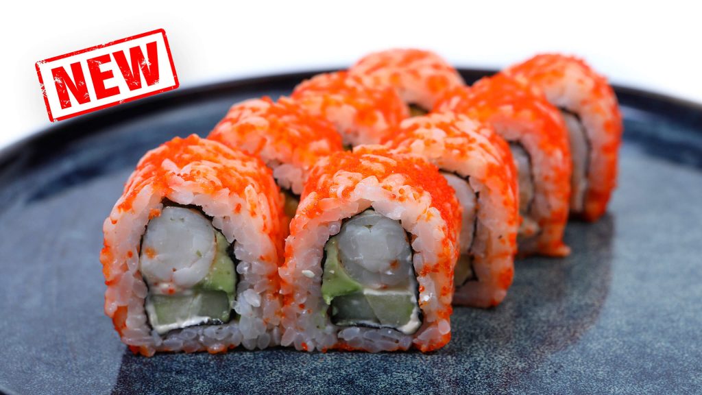 Тигровые креветки, рис, авокадо, огурец, водоросли нори, икра масаго, соус ел.